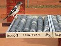Nuori Butcher Bird seisoo laatikossa, jossa on maan alta porattuja kivisydämiä.